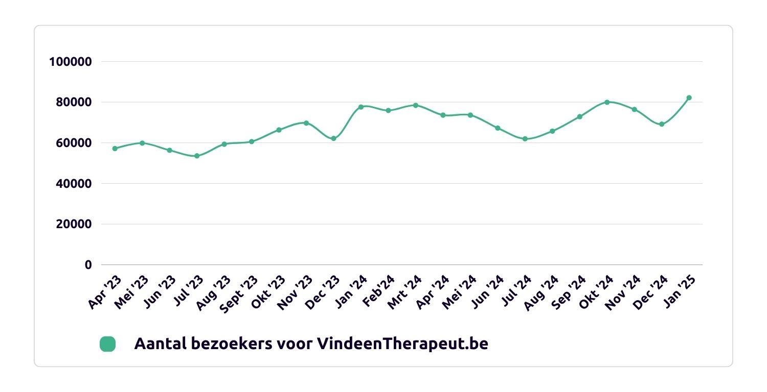 Sinds de oprichting van VindeenTherapeut.be is het aantal websitebezoeken gestegen van 0 naar meer dan 80.000 websitebezoeken per maand! Dat betekent dat elke maand opnieuw ontzettend veel mensen de profielen op VindeenTherapeut.be bekijken.