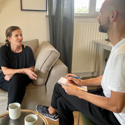 Intakegesprek: Een yogatherapie traject begint meestal met een uitgebreid intakegesprek waarin de yogatherapeut je gezondheidsachtergrond, symptomen, doelen en behoeften bespreekt.